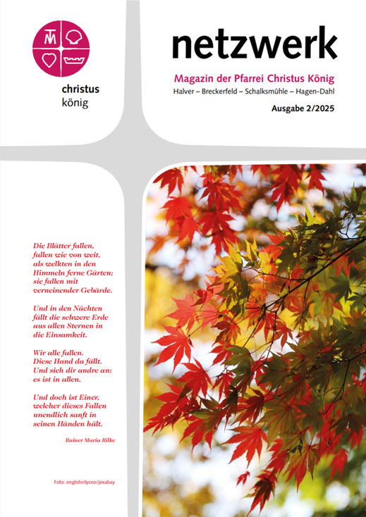 Das Pfarreimagazin "Netzwerk" berichtet ca. 3 mal im Jahr über das Leben in unserer Pfarrei. Ihre Anregungen, Vorschläge und Kritik erreichen das Redaktionsteam unter: netzwerk@christus-koenig.de. Die aktuelle und die vorhergehenden Ausgaben finden Sie hier.